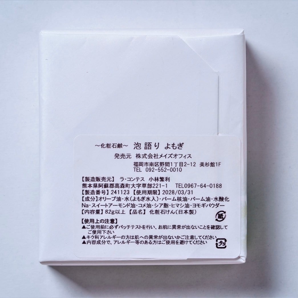 【全成分】オリーブ油、水(よもぎ水入)、パーム核油、パーム油水酸化Na、スイートアーモンド油、コメ油、シア脂、ヒマシ油、ヨモギパウダー