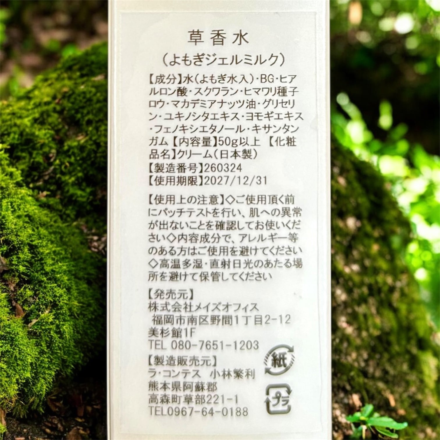 【全成分】水(よもぎ水入)、BG、ヒアルロン酸、スクワラン、ヒマワリ種子ロウ、マカデミアナッツ油、グリセリン、ユキノシタエキス、ヨモギエキス、フェノキシエタノール、キサンタンガム